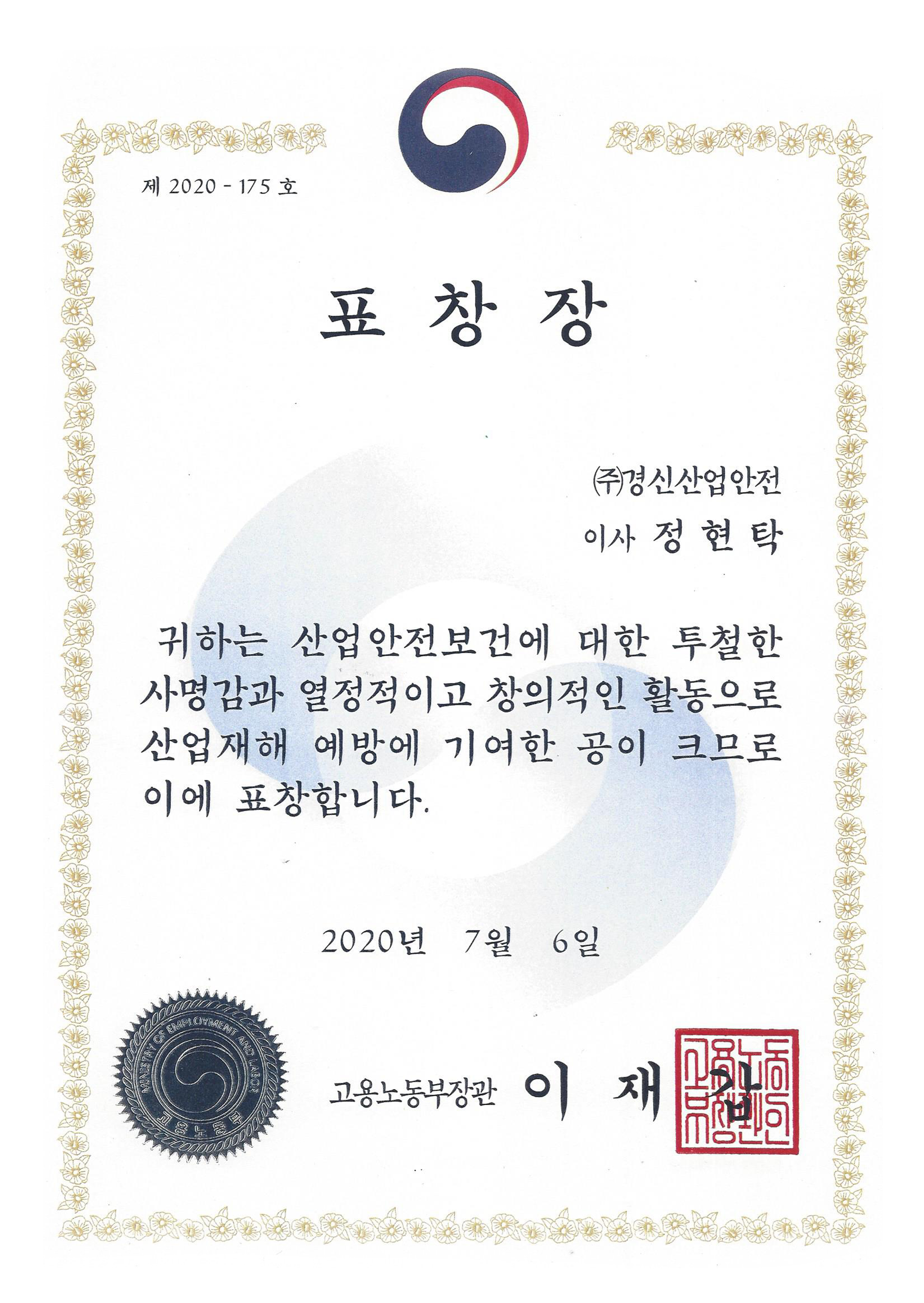 "2020년도 산재예방유공자 포상 [노동부장관상]"